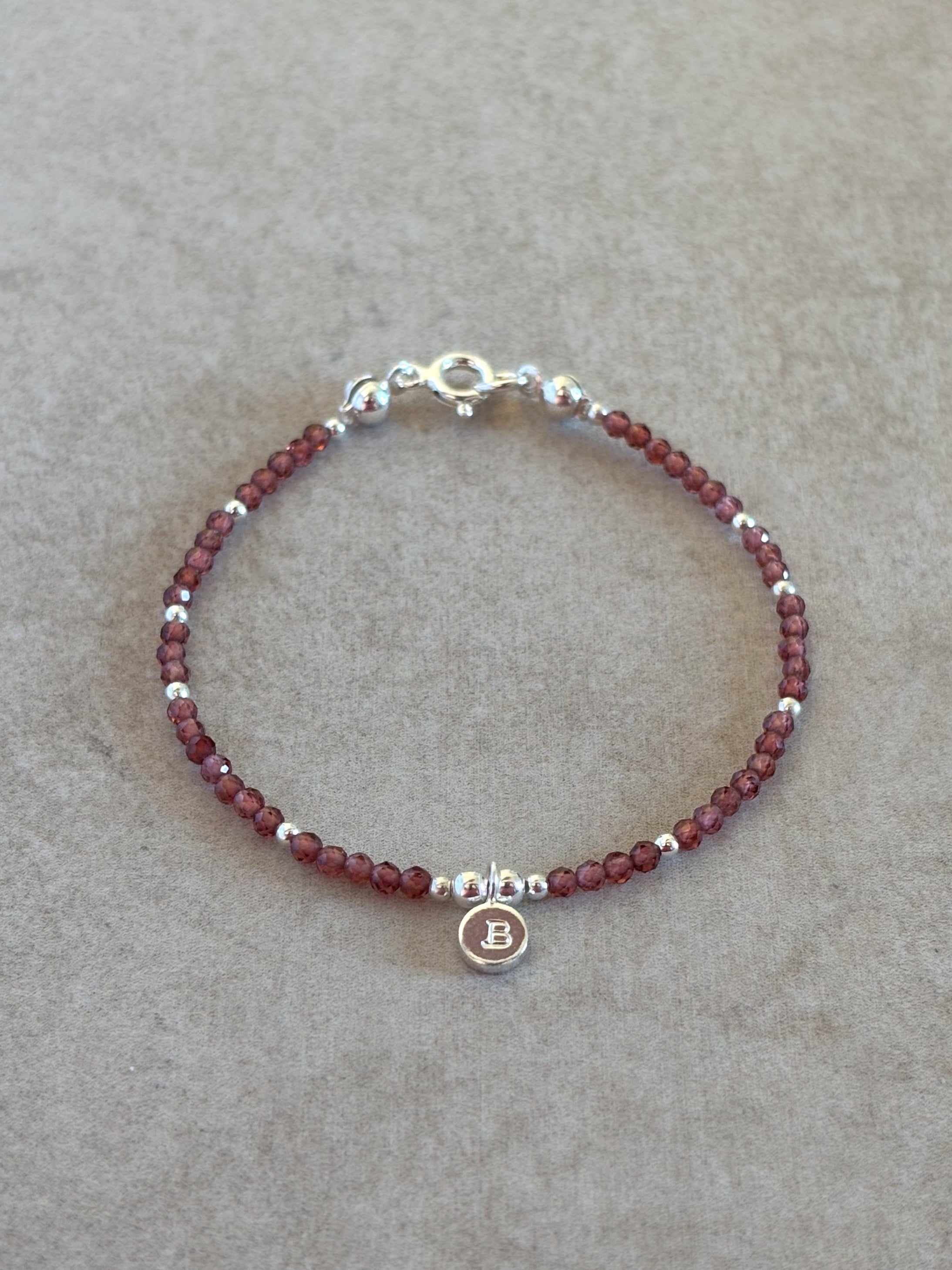 • Beads: Natural garnet faceted gemstone beads, and a centred hand-stamped initial pendant.