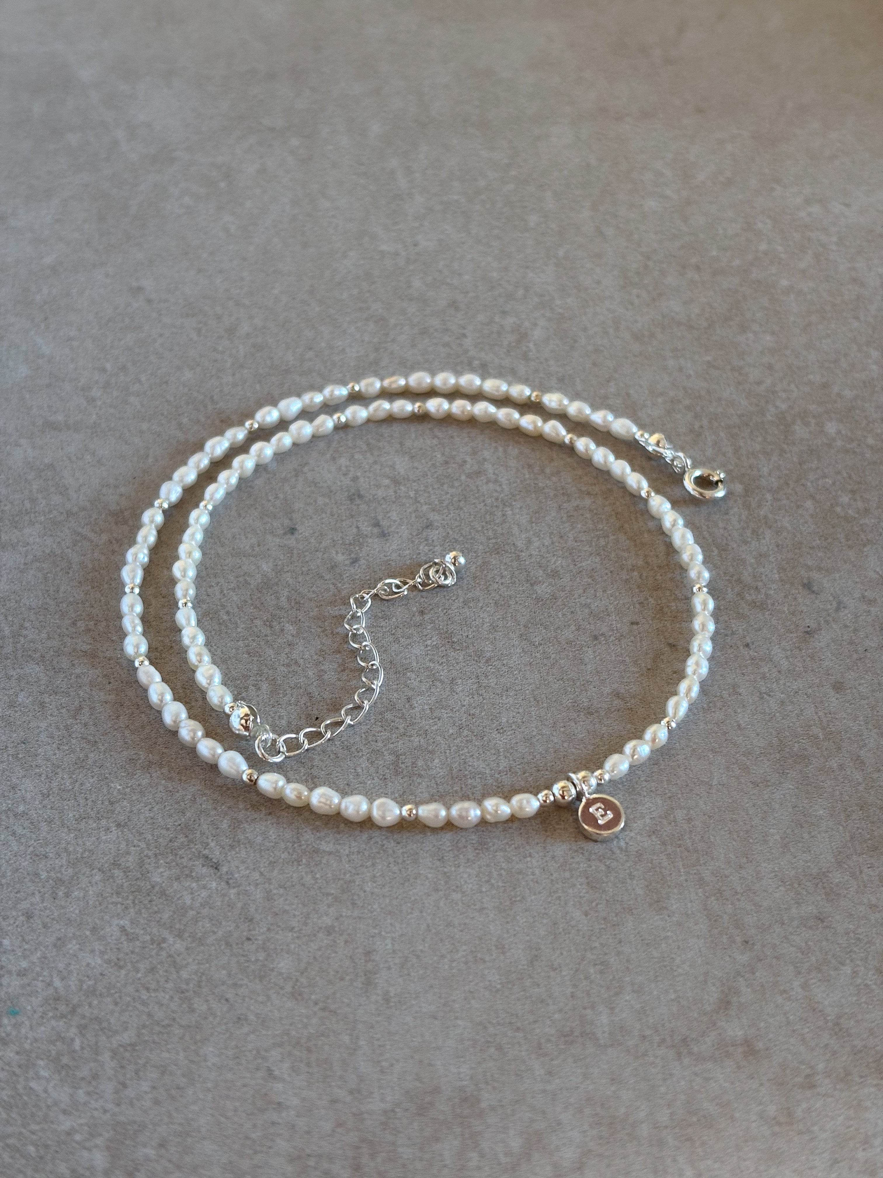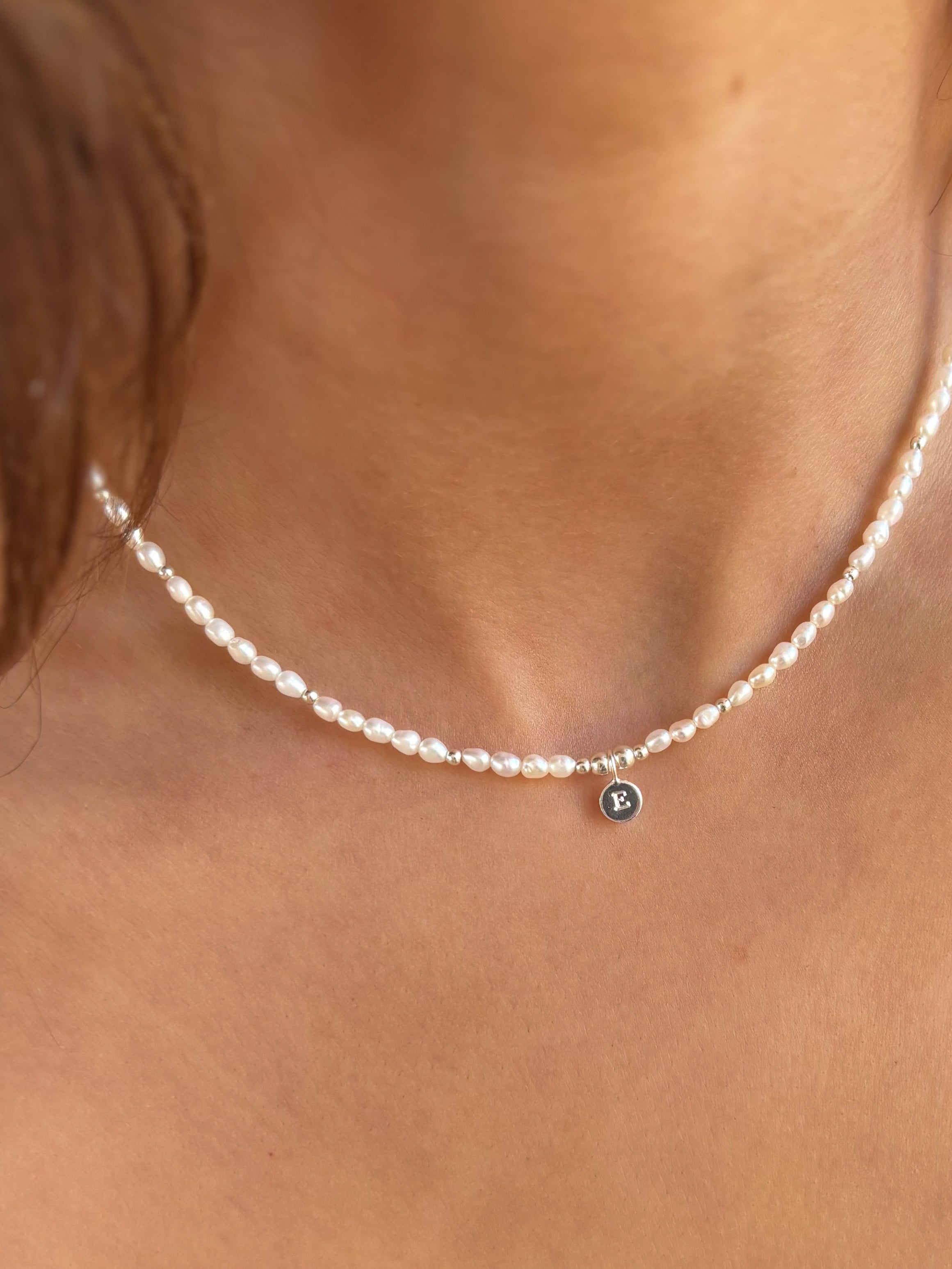 - Beads: Natural 3mm freshwater pearl beads, and a centred hand-stamped initial pendant.